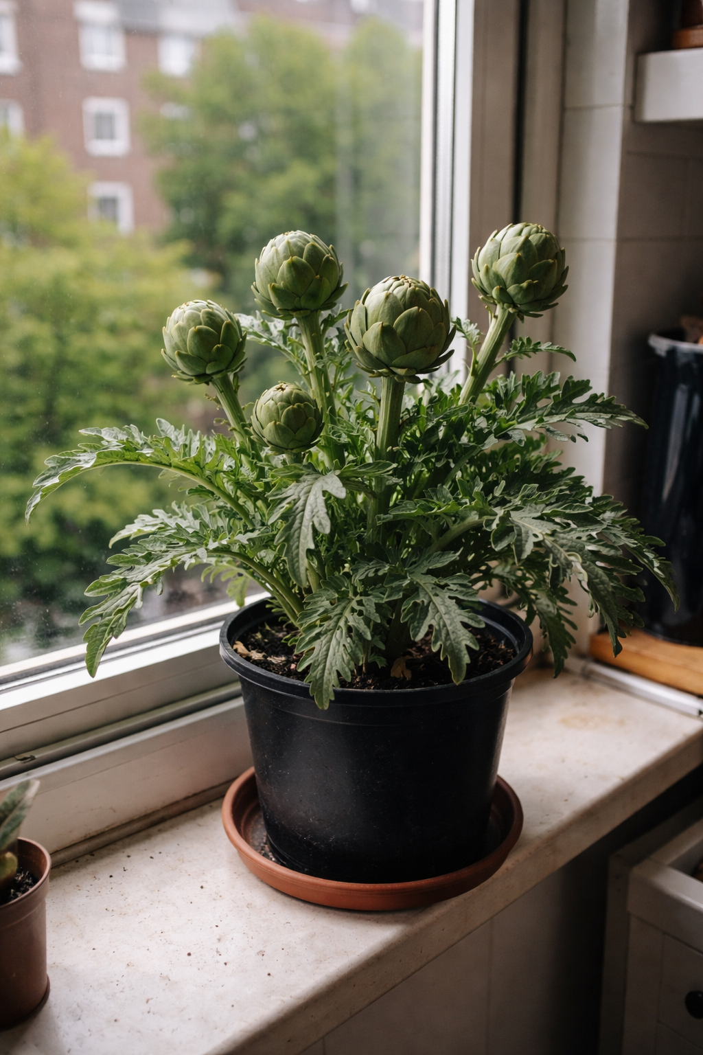 Поставте горщик Р9 у добре освітлене місце — підвіконня або засклений балкон. Артишок любить світло і стабільну температуру.