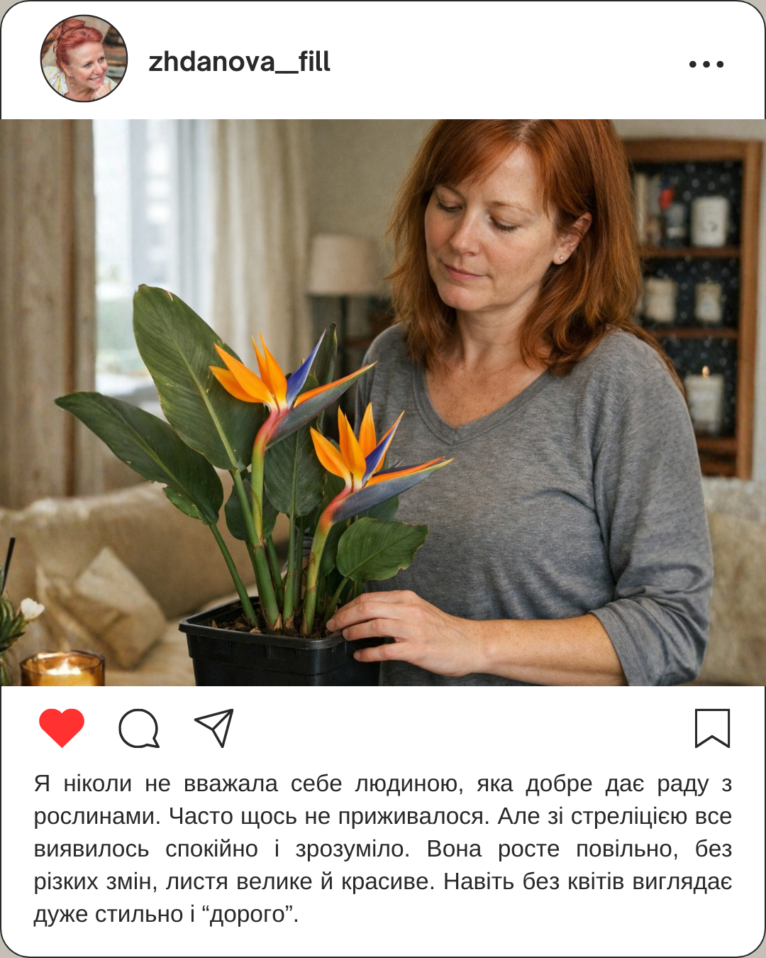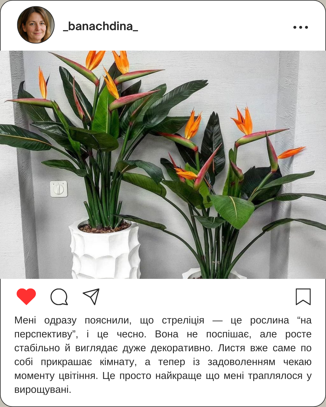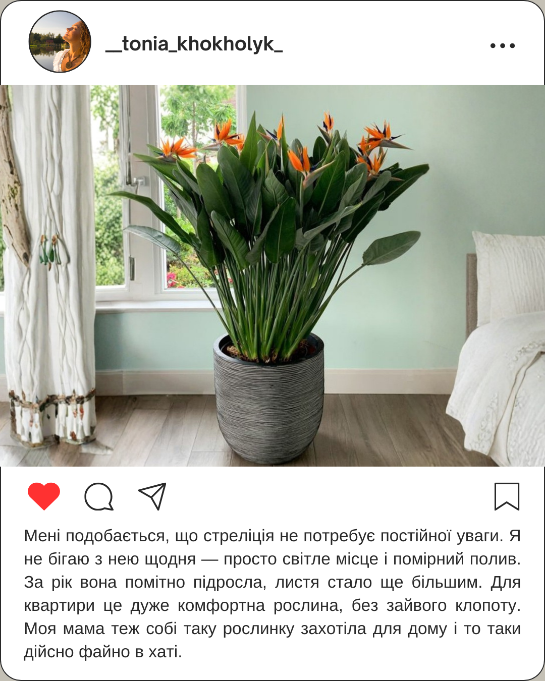 Стреліція — ефектна екзотична рослина для квартири, яку цінують за великі виразні листки та унікальні квіти.