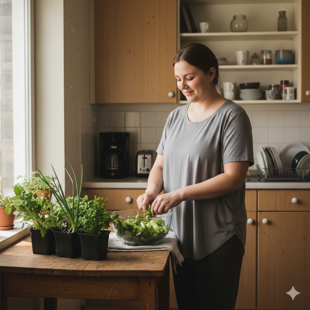 Домашній салат набагато соковитіший, ніж магазинний. Дає красиві хрусткі листочки, які можна зрізати частинами — і рослина відновлюється. Ідеально росте на підвіконні, навіть у півтіні. З нього виходить ідеальна основа для салатів, сендвічів та легких страв.