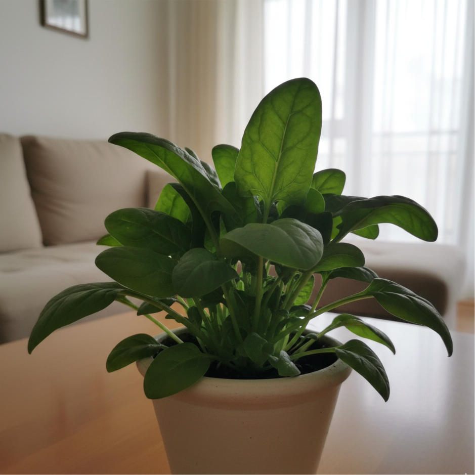 Кімнатний шпинат росте густо, дає багато великих еластичних листків і швидко відновлюється після зрізання. Ідеальний для салатів, смузі, омлетів, пасти та щоденних корисних страв. У квартирі формує міцні, щільні листочки та зберігає смак набагато довше, ніж магазинний. Ви зрізаєте частину — і шпинат знову відростає хвилями, завжди даруючи свіжу порцію вітамінів.